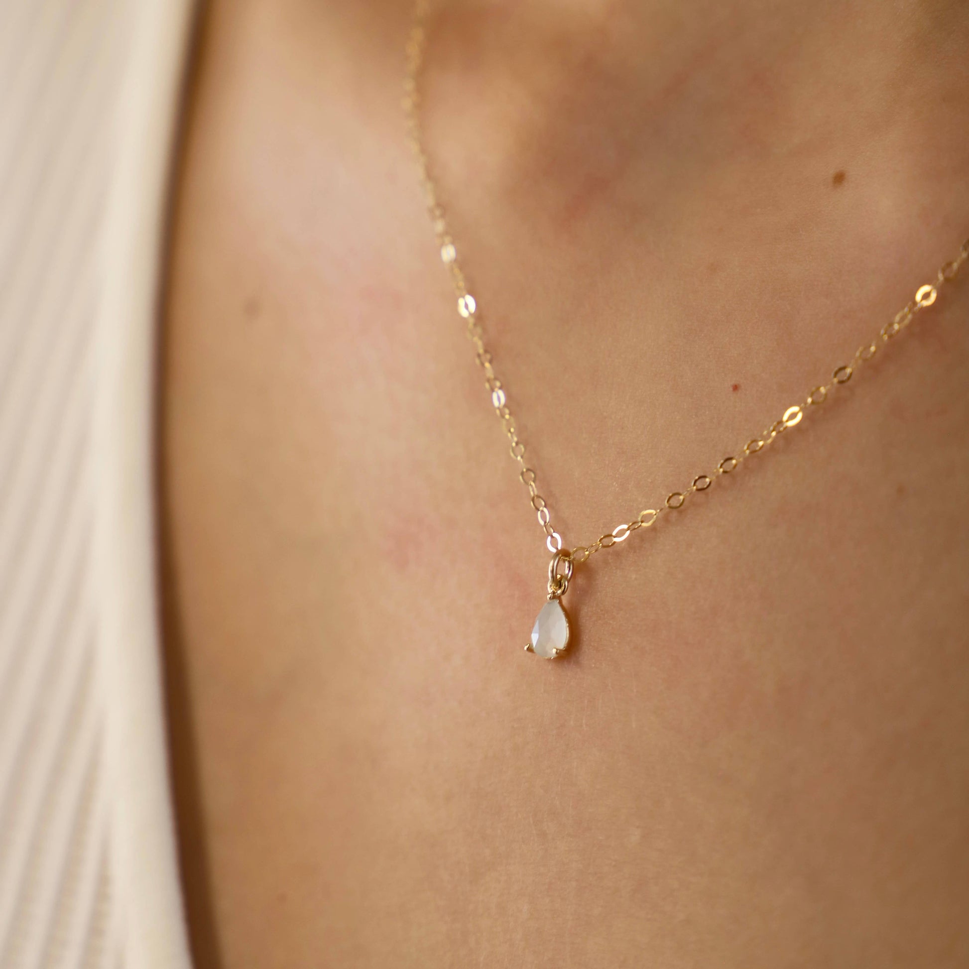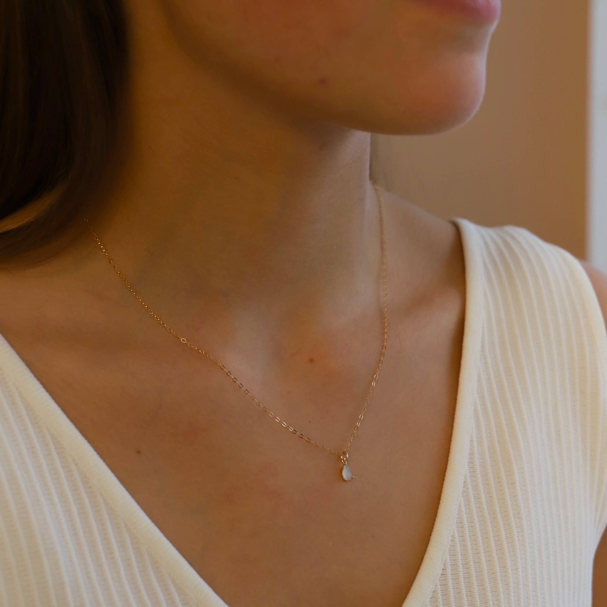 This simple necklace features a teardrop aqua charm that sits on a gold filled 18" chain.
